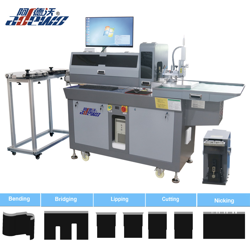 Cutia ondulată ABM-8105B Dies Auto Bender Machine a inclus funcții: îndoire, pod, perforație, lipire și tăiere. Grosimea regulii de oțel suportate 0,45,0,53,0,71,1,05 mm, înălțime 8-32mm. Adewo a experimentat o echipă de ingineri software, proiectanți 3D, tehnicieni tăiați cu matrițe și ingineri mecanici. Cuprinde cu experiență de tăiere a morții de 20 de ani și tehnologie modernă CNC, suntem angajați cu soluții de înaltă precizie, de înaltă eficiență, de înaltă performanță.