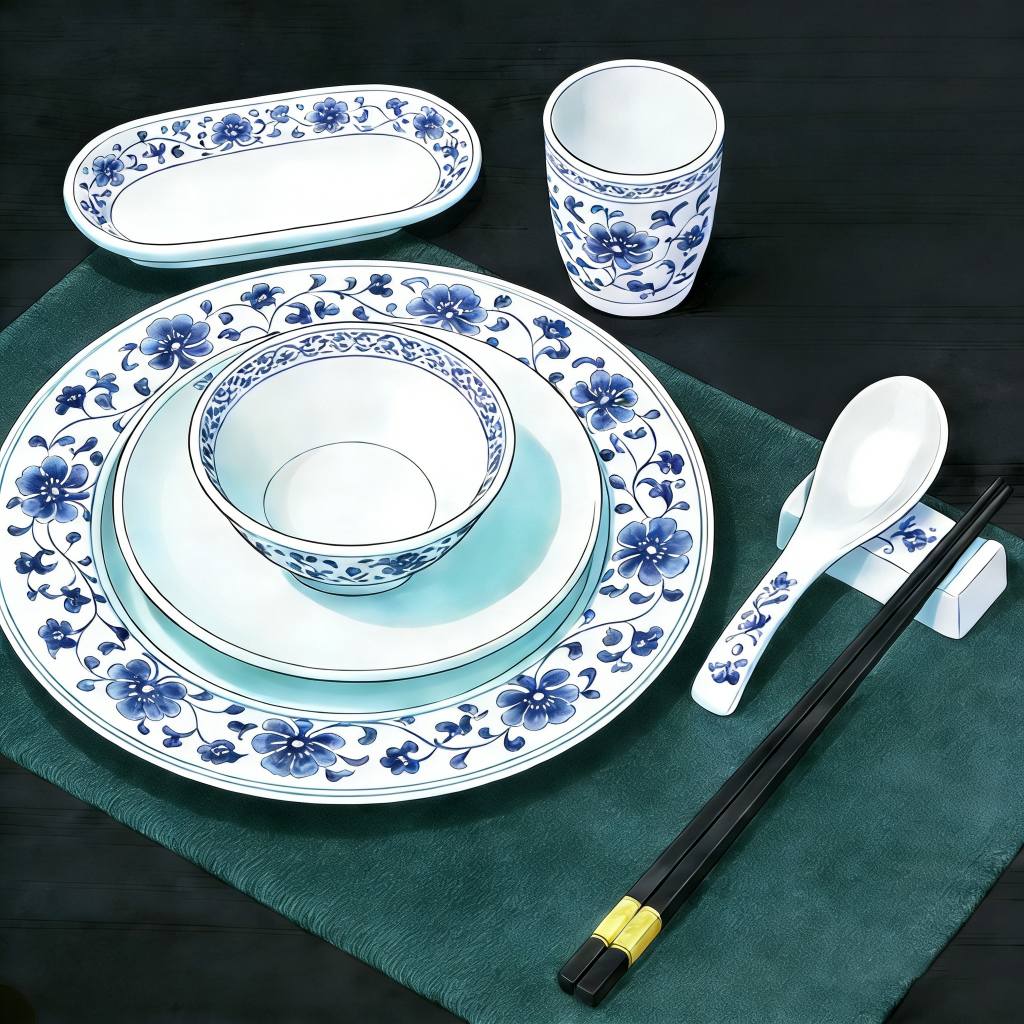 Când vine vorba de veselă, ustensilele chinezești obișnuite includ căni, farfurii, boluri, vase, bețișoare și linguri, toate aranjate de obicei în fața fiecărui restaurant. Printre convenții, „a bate bețișoare pe boluri” este un tabu notabil. Acest lucru provine din practica cerșetorilor antici care își bateau bolurile pentru a atrage atenția în timp ce cerșeau, făcând actul considerat nepoliticos la masa de luat masa.